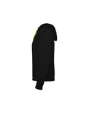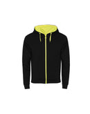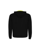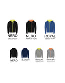 Felpa in french terry con particolari in colore fluorescente. Zip centrale con tiretto ad anello a contrasto in colore fluo. Cappuccio con fodera in tessuto poliestere microforato a contrasto colore fluo, coulisse e occhielli in metallo a contrasto colore fluo. Maniche lunghe con polsini e girovita in costina . Due tasche anteriori con ampie cuciture a vista. Copri cuciture rinforzate all'interno del collo.