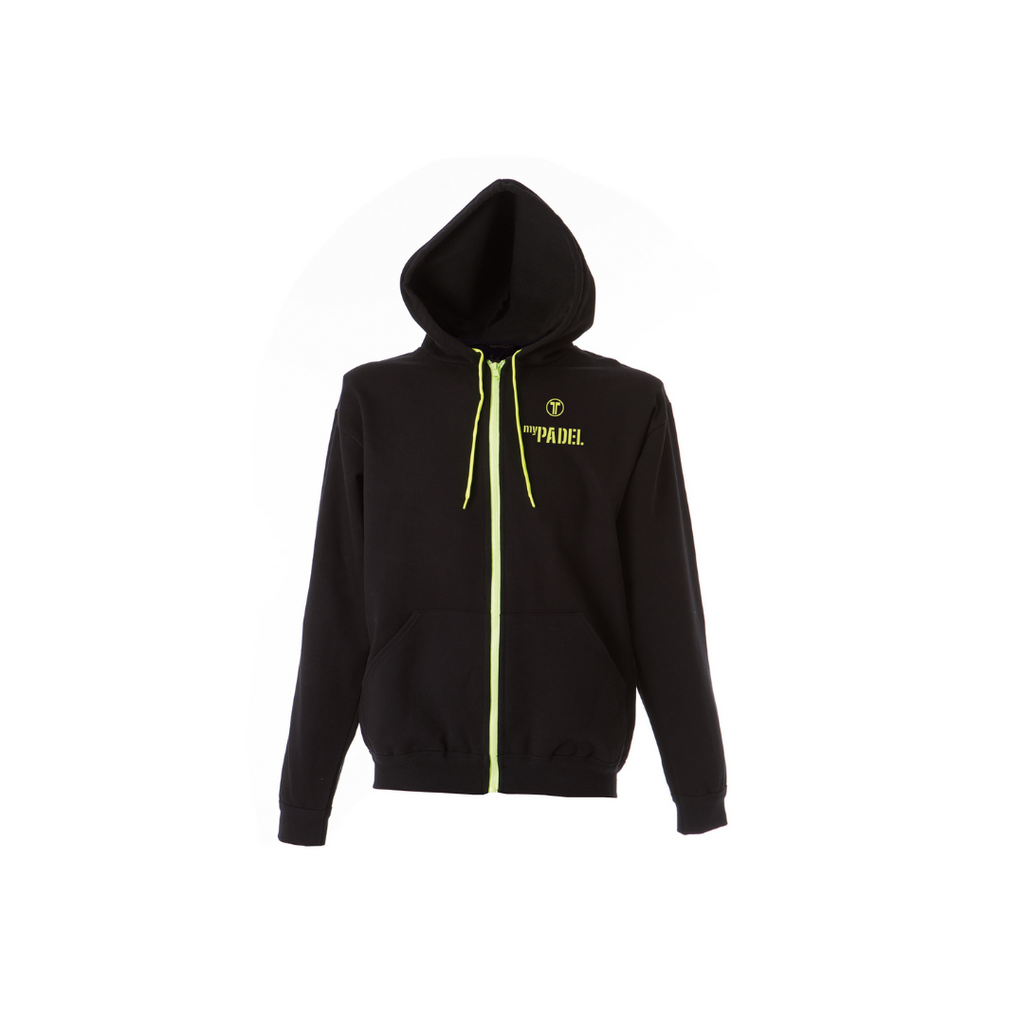 Felpa cotone – poliestere- Composizione: 80% cotone – 20% poliestere- Cappuccio con cordini fluo- Zip lunga fluo- Tasche a marsupio- Polsini e fondo maglia in costina- Cuciture ribattute