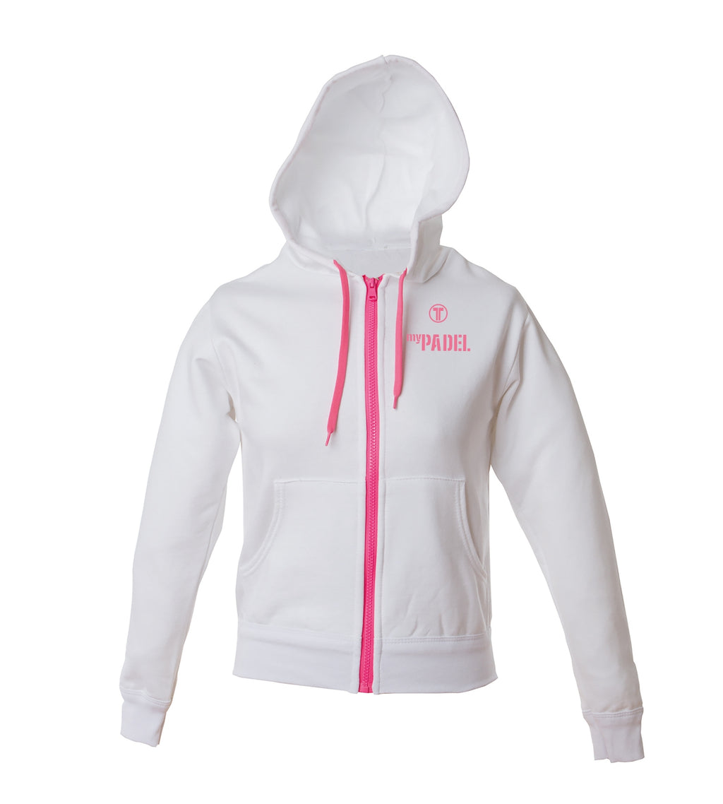 Felpa cotone – poliestere- Composizione: 80% cotone – 20% poliestere- Cappuccio con cordini fluo- Zip lunga fluo- Tasche a marsupio- Polsini e fondo maglia in costina- Cuciture ribattute.