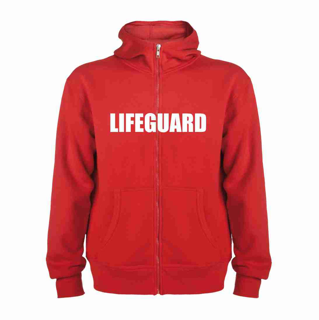 Felpa unisex LIFEGUARD con cerniera frontale e cappuccio. Zip abbinata. Tasche a marsupio, cappuccio, polsini e cintura a coste 2x1 con elastan. Cuciture nastrate in tessuto coordinato.
