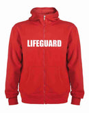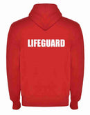 Felpa unisex LIFEGUARD con cerniera frontale e cappuccio. Zip abbinata. Tasche a marsupio, cappuccio, polsini e cintura a coste 2x1 con elastan. Cuciture nastrate in tessuto coordinato.